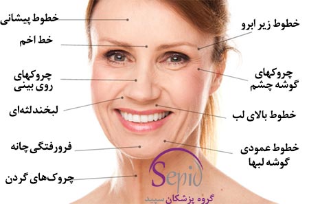 - خطوط و چین و چروک اطراف لب، چشم و پیشانی