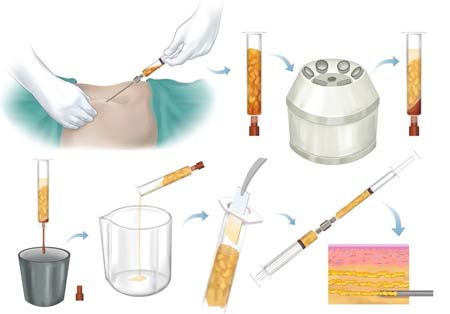 تزریق چربی را می‌توان تحت بی‌حسی موضعی یا تزریق آرام‌بخش انجام داد. متخصص چربی را با سرنگ‌های کوچک یا لیپوساکشن از پهلو، بخش داخلی یا خارجی ران، کمر یا پایین شکم خارج می‌کند. سپس چربی در سانتریفیوژ قرار داده و تخلیص می‌شود. در مرحله آخر چربی آماده شده در ناحیه مورد نظر تزریق می‌گردد. برای این که چربی به طور یکنواخت در ناحیه درمان پخش شود، متخصص هر بار مقادیر اندکی از چربی را در بافت‌ها تزریق می‌کند تا بافت سالم به خوبی دور چربی تزریق شده را بگیرد. به این ترتیب چربی جدید با بافت‌های پیرامونی در تماس می‌ماند و اکسیژن و مواد مغذی را از آنها دریافت می‌کند. بیمار هنگام خارج کردن چربی و تزریق مجدد آن فشار، حرکت و تیر کشیدن ملایمی را حس می‌کند، در کل تزریق چربی درمان دردناکی نیست. در صورت احساس درد می‌توان از مسکن استفاده کرد.
